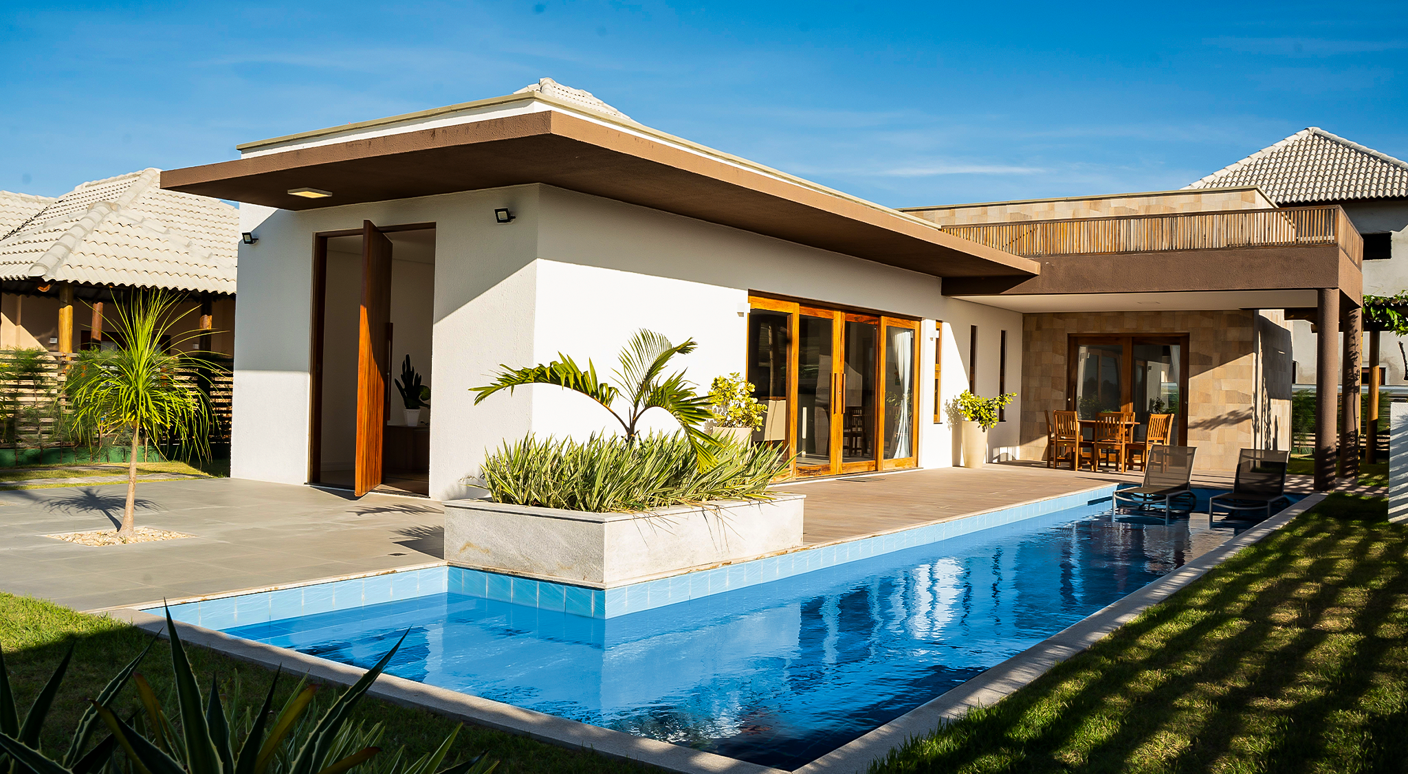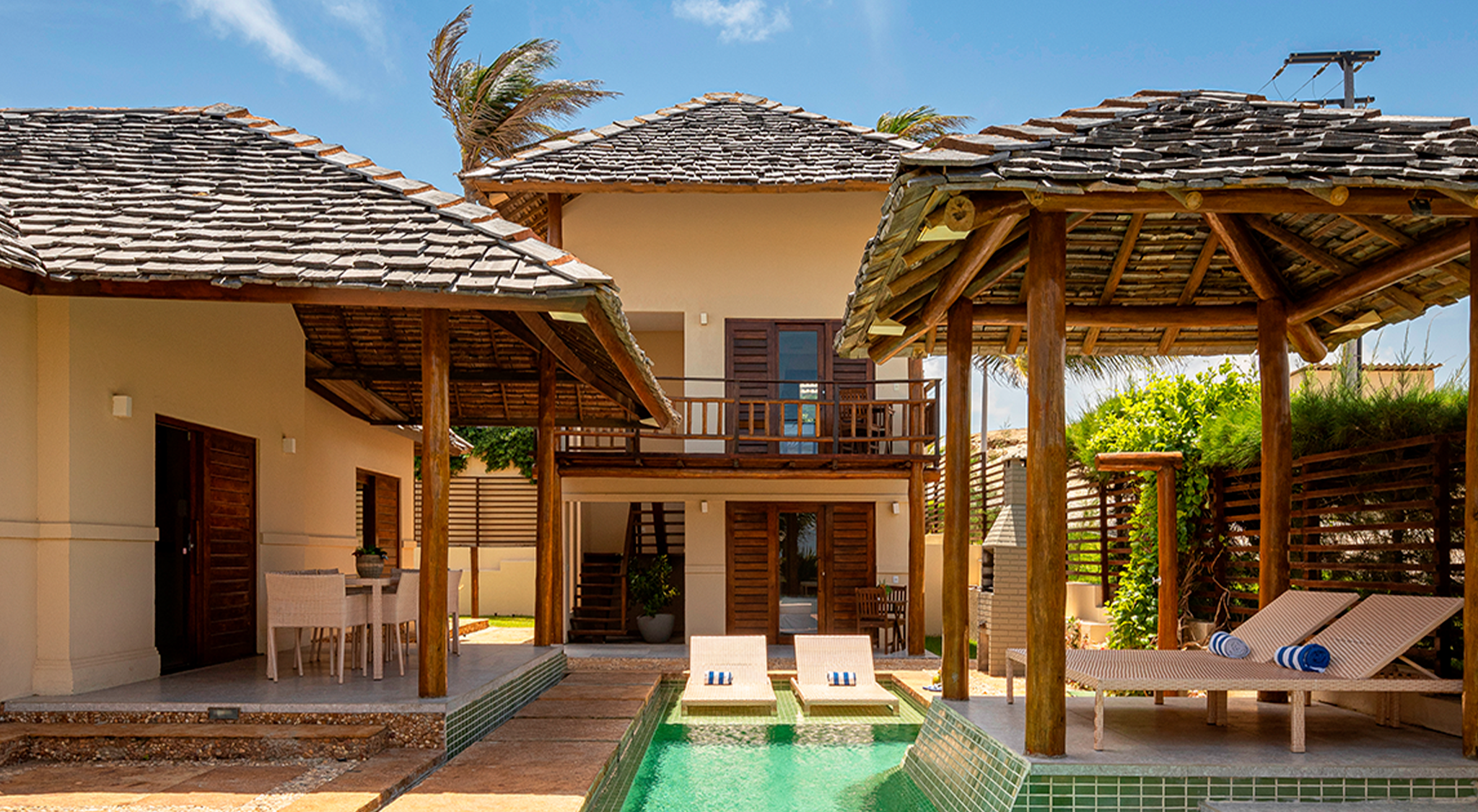 Projetada com dois espaços separados, a villa principal inclui: área de estar, cozinha e sala de jantar e uma suíte. Ao lado da villa principal estão as outras duas suítes: térrea e superior.